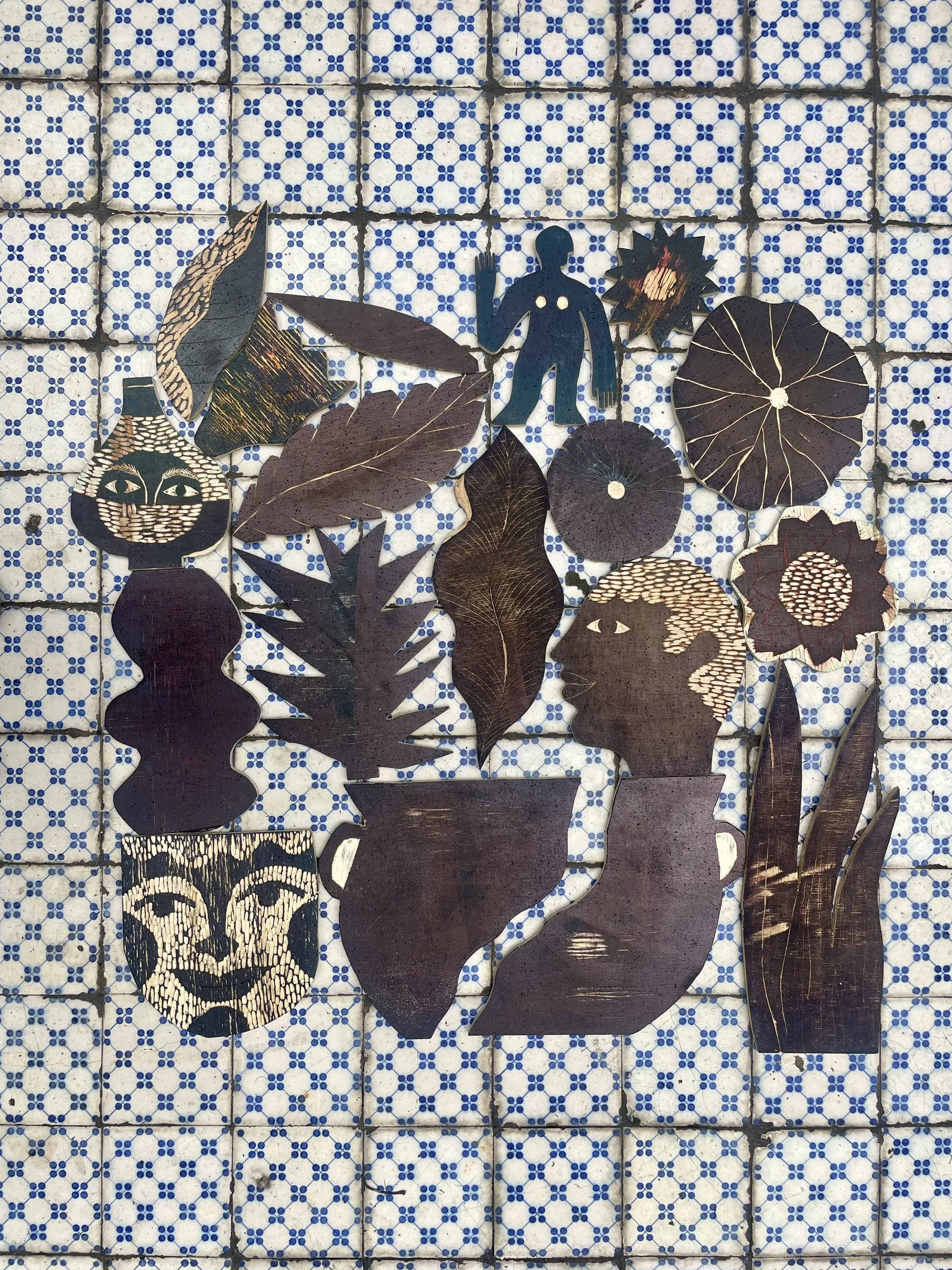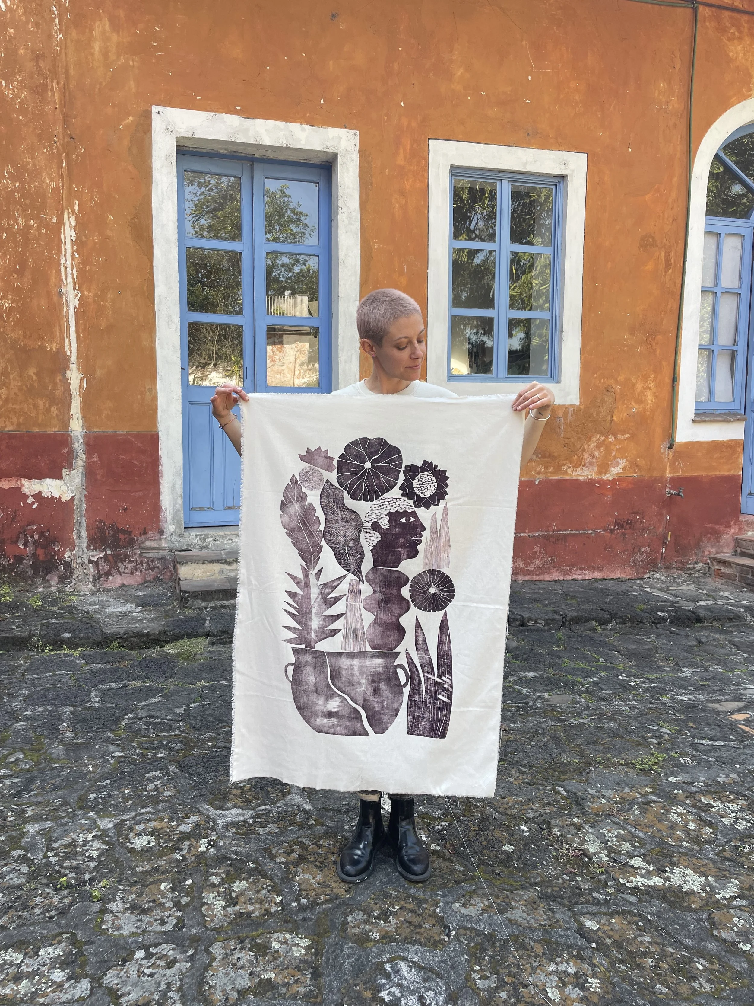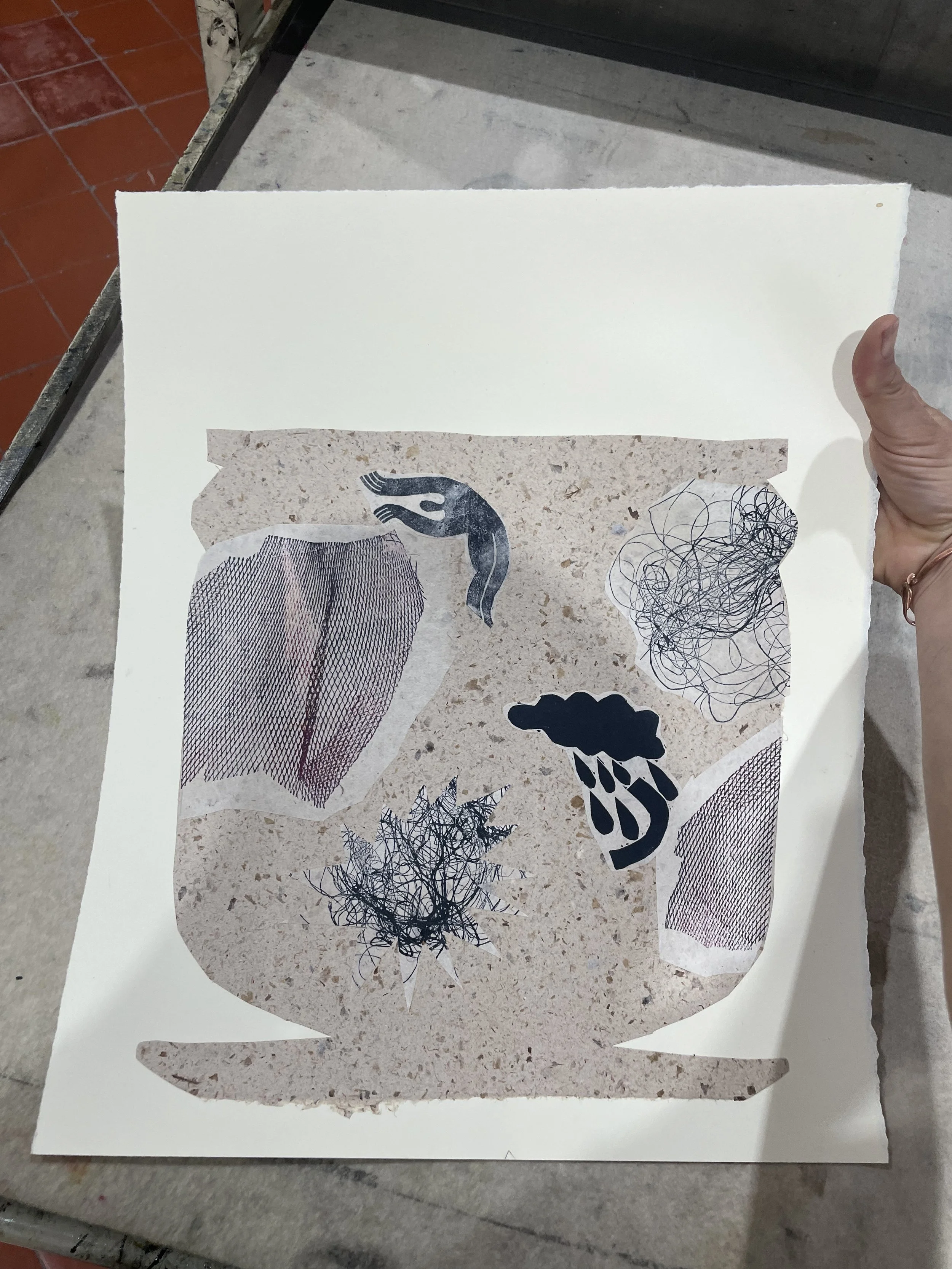 I spent the remaining time learning how to use the bandsaw to cut wood pieces I found in the reuse bin and carve and print them on paper and fabric sourced from a local tienda. On top of these prints I built layers using collograph plates and experimented with Chine-collé - adhering delicate papers to heavier sheets. All this experimenting resulted in a lot of prints I did NOT like, but the ones I did felt even more special.