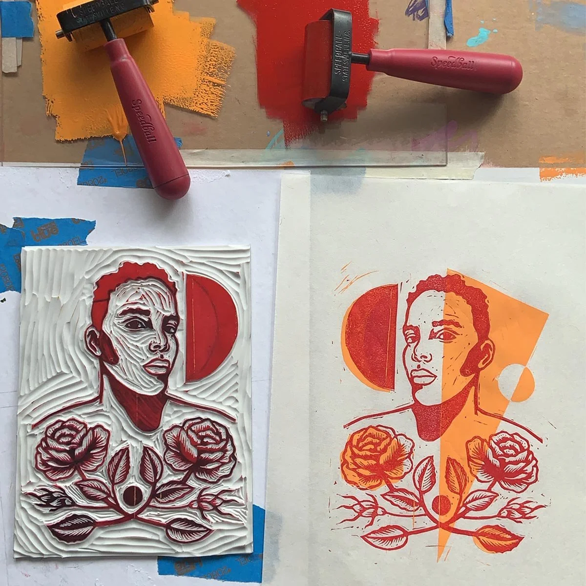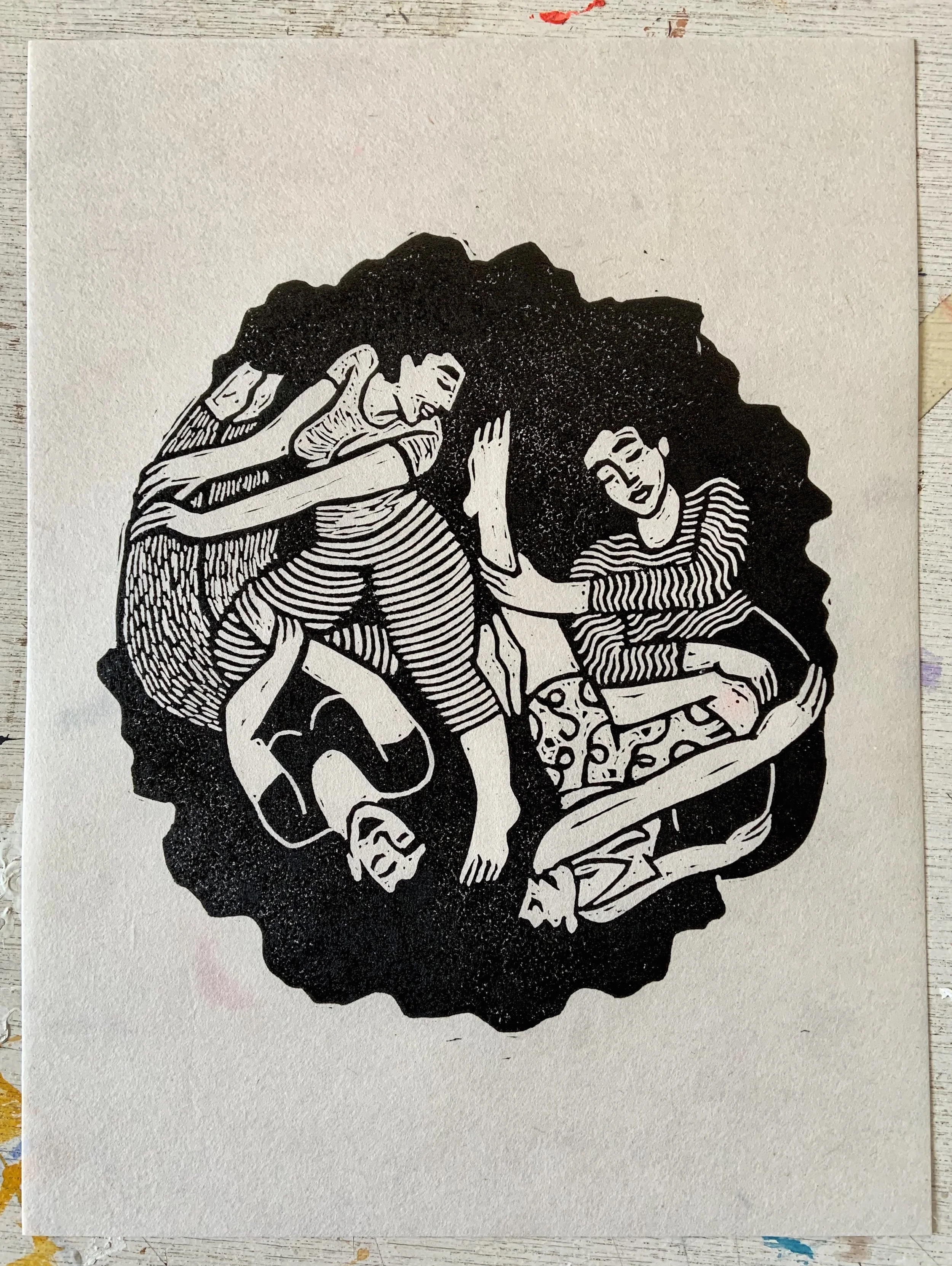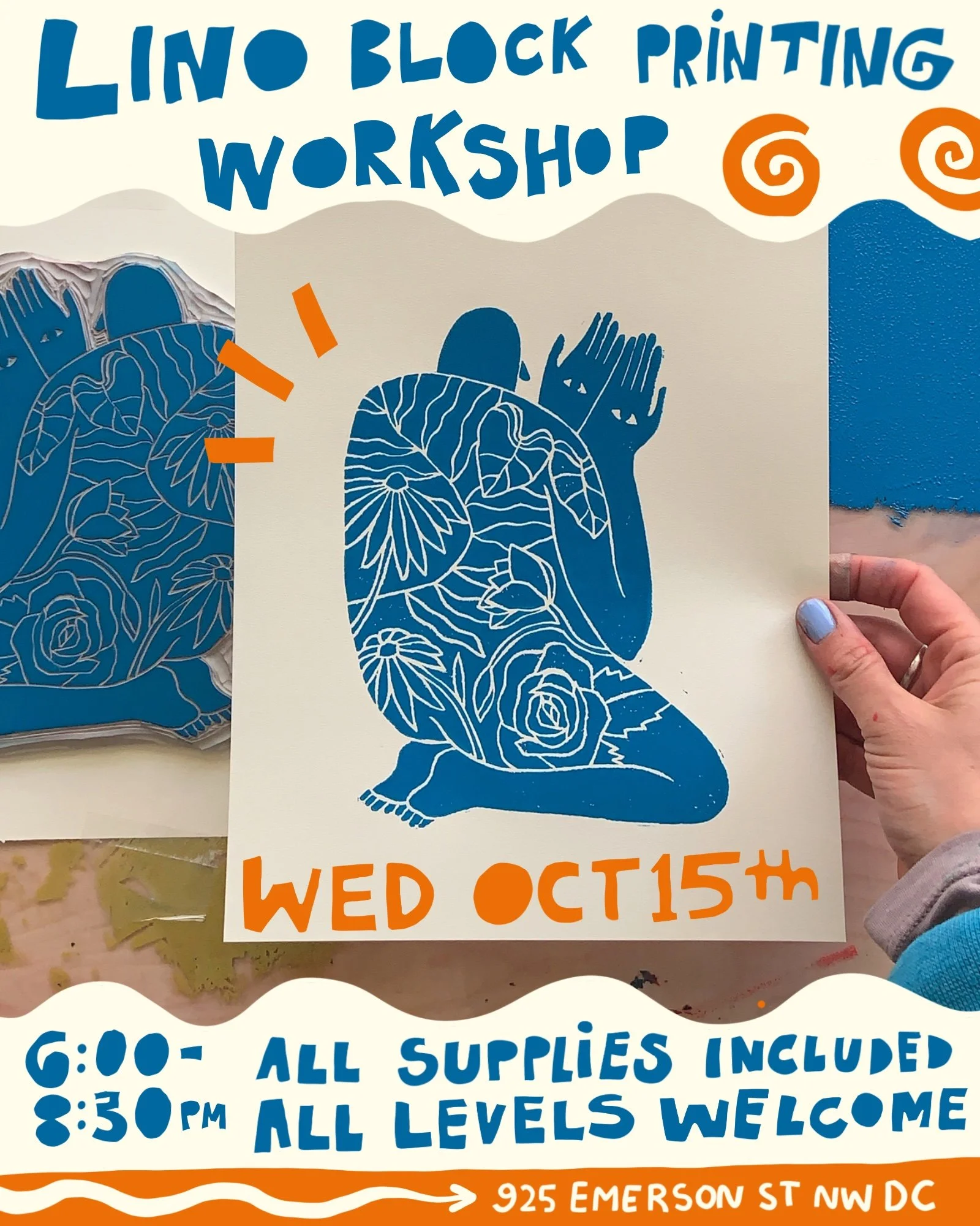 Lino Block Printing Workshop Wednesday October 15th Lino block printing workshop graphic Lino block print of people in a circle Image of freshly stamped Lino block carving