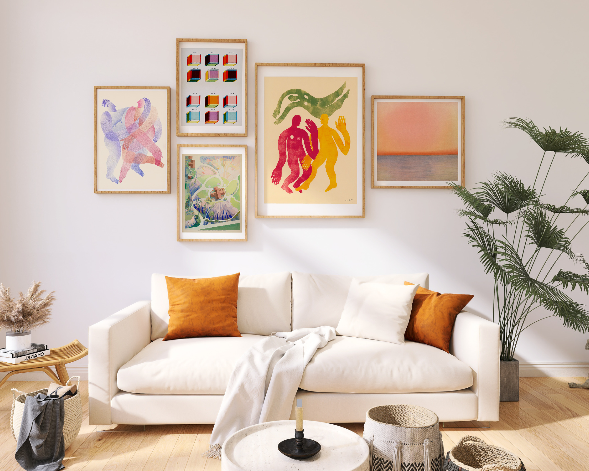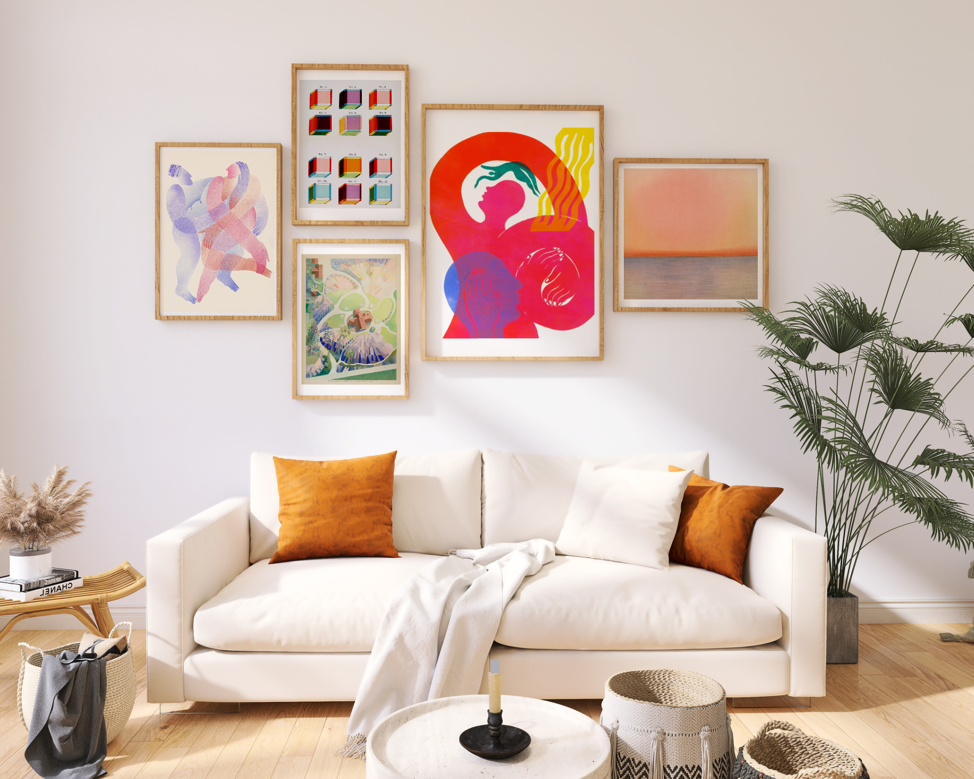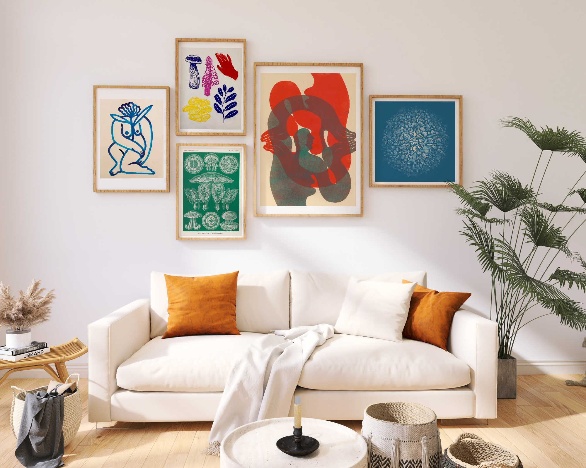 Solar Reach Artwork featuring a large red figure in the center surrounded by smaller colorful figures and shapes. Solar reach print shown within a gallery wall including several pieces of artwork.