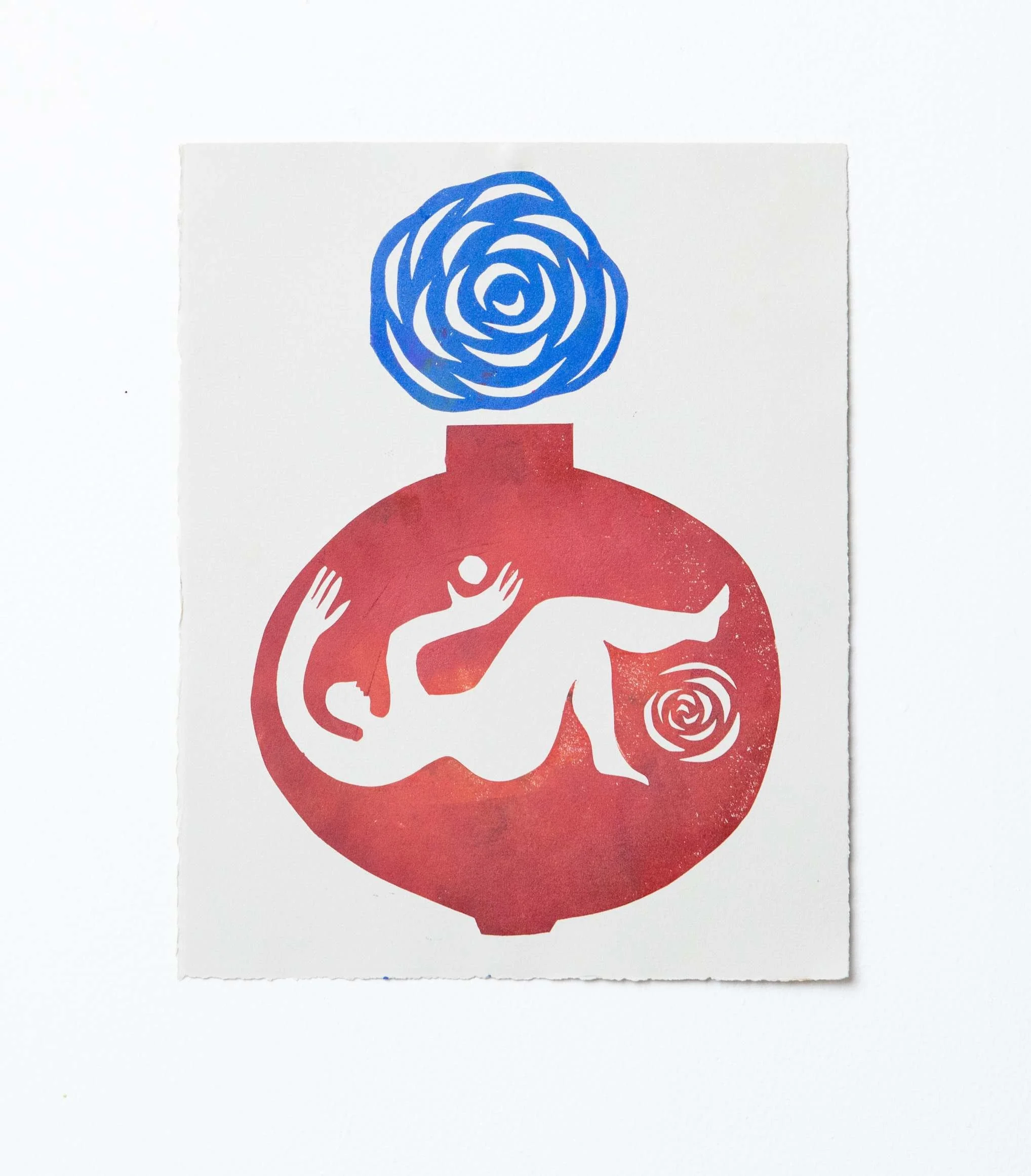 Red and Blue Bloom Pomegranate-shaped vessel with human figure inside and blue flower blooming out.