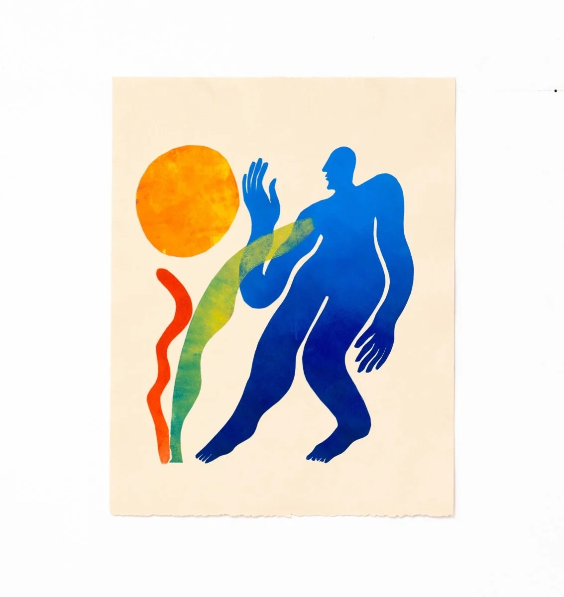 Under the Sun Artwork featuring vibrant blue figure and colorful abstract shapes. Artwork is reminiscent of Henri Matisse.