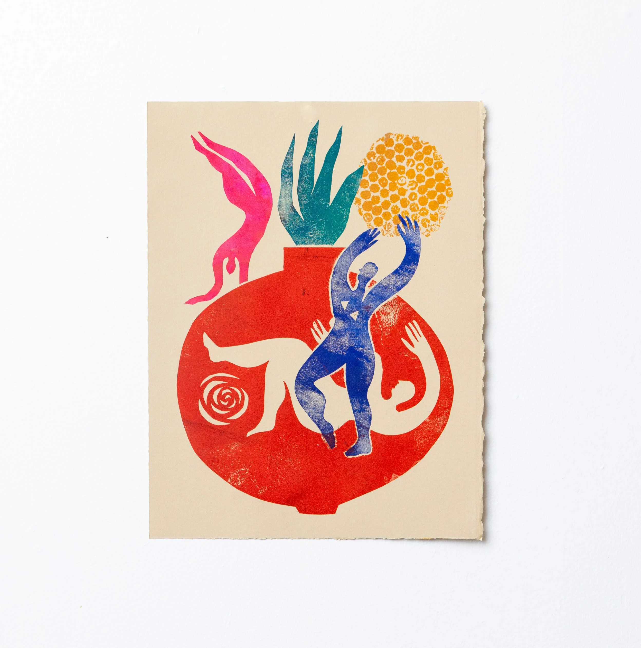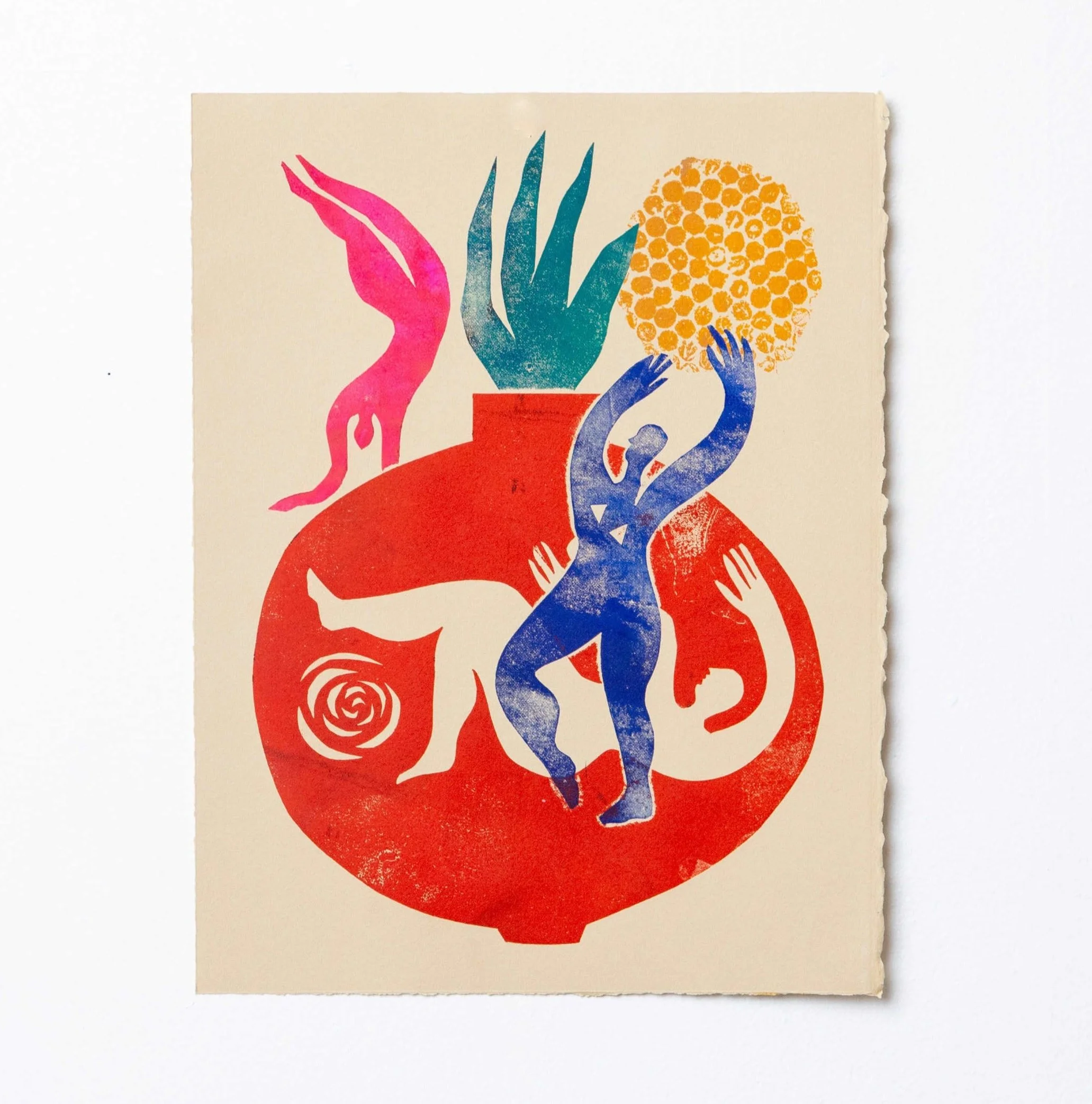 In Her Garden Red figure sitting surrounded by nature-inspired elements. Print is reminiscent of designs by Henri Matisse or Keith Haring.