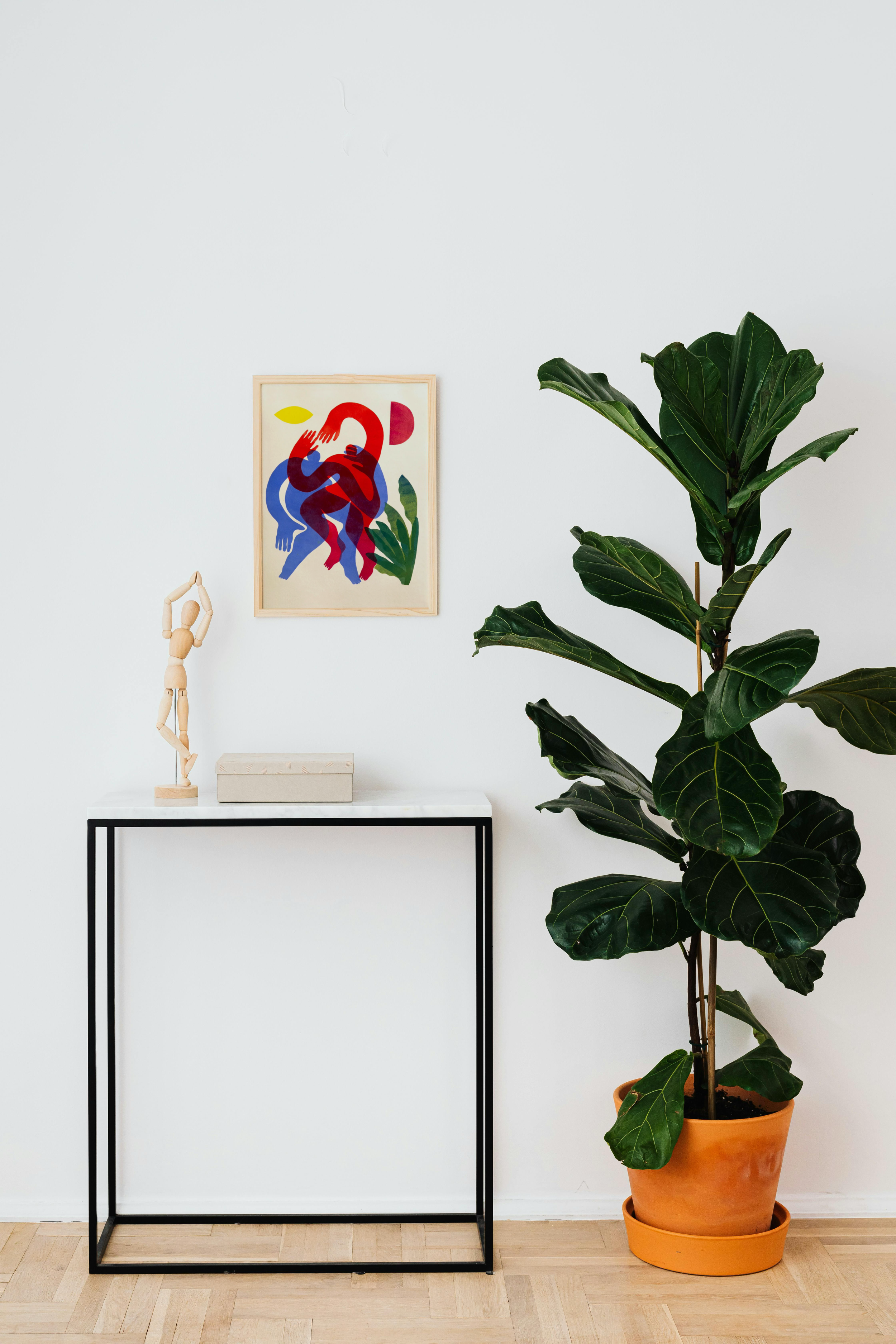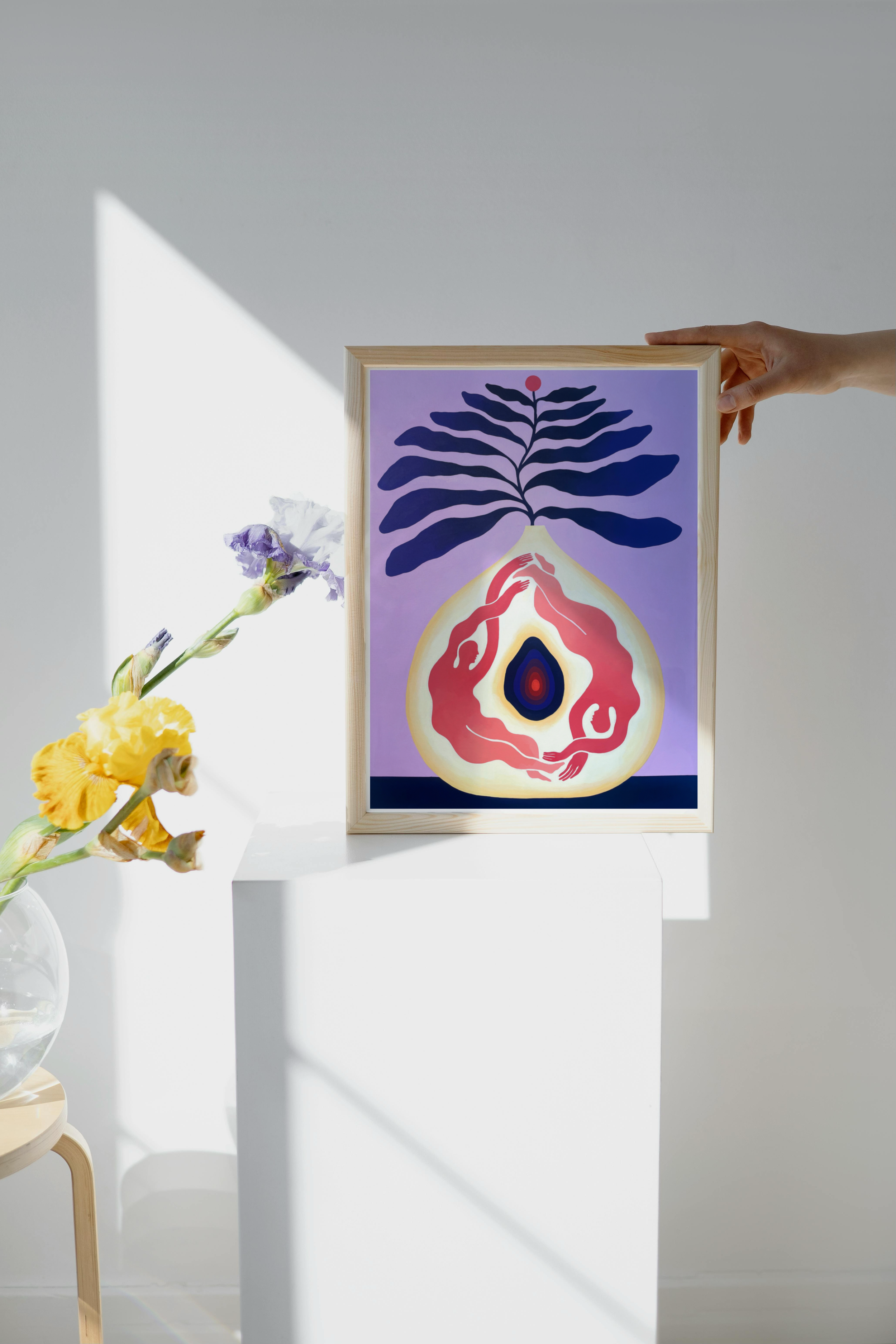 Violet Garden Vibrant art print featuring colorful forms surrounding a violet human figure reminiscent of Henri Matisse and Keith Haring. Styled photo of print in frame, hanging above a small side table with a fiddle leaf fig tree on the right.
